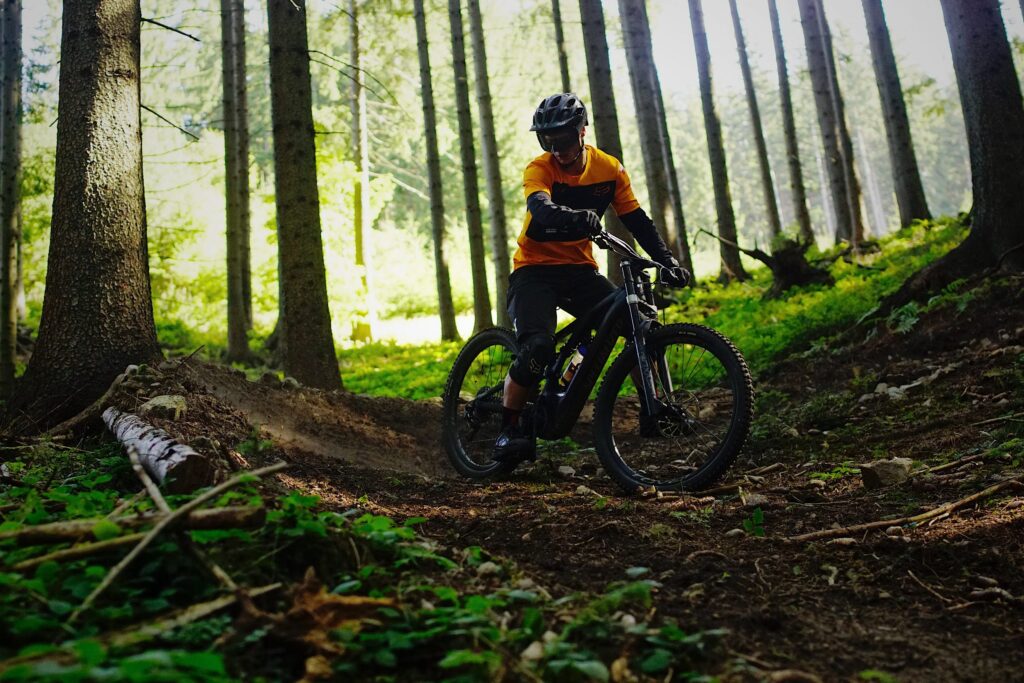Prawdę mówiąc, na początku sami zadaliśmy sobie to pytanie. Zjazdowy elektryk? Gdzie na tym jeździć? Przecież w Bikeparkach są wyciągi, a enduro single nie są aż tak wymagające żeby wybierać się na nie na zjazdówce. Niemniej jednak wsiedliśmy na nowe Kenevo, zerknęliśmy na mapę i ruszyliśmy w stronę spotu testowego przez las – na przestrzał. Odpaliliśmy wspomaganie i rura w górę! Nie ważne co trafiło pod nasze koła – korzenie, kamienie, patyki, błoto, czy piach – po prostu zasuwaliśmy jak pociąg po szynach. Do wyboru mieliśmy trzy tryby wspierające rowerzystę, ale już trochę nas znacie… Nie bawimy się w półśrodki – maksymalna moc sprawiła, że prędkość, z jaką jechaliśmy POD GÓRĘ dostarczyła nam niemałej frajdy. Jechaliśmy tak szybko, że bez obciachu można by z taką prędkością lecieć w dół po niejednej zjazdowej trasie. Totalny kosmos…